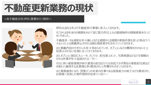 私自身も同じエリアを商圏とする多くの企業が同じ物件の更新を毎日行っている現状に長年疑問があった。