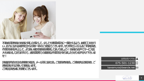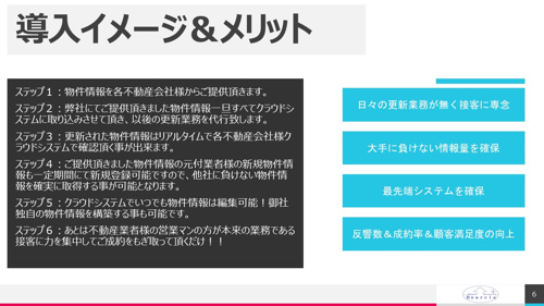 仲介営業マン本来の業務である接客応対に集中でき、お客様にとって物件情報プラスその他有益な情報を取得、提供する時間にあてる事ができる。